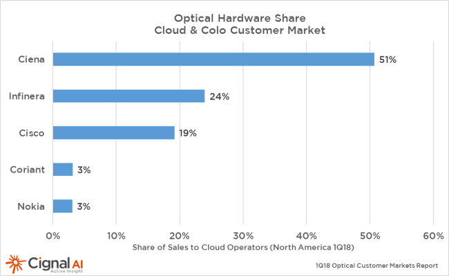 “在北美,2018年第一季度表現(xiàn)最好的客戶市場(chǎng)是有線MSO市場(chǎng),”Cignal AI首席分析師Andrew Schmitt表示?!霸七\(yùn)營(yíng)商并沒有增加購(gòu)買光學(xué)設(shè)備,這與目前的普遍認(rèn)知相反。Ciena和Infinera經(jīng)歷的來自云運(yùn)營(yíng)商的收入的增長(zhǎng)是以犧牲其他廠商的收入下滑為代價(jià)的?!?