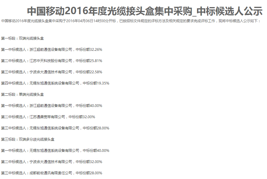 中國移動2016年度光纜接頭盒集中采購于2016年04月06日14時00分開標,已按招標文件規(guī)定的評標方法及相關規(guī)定的要求完成評標工作,現(xiàn)將中標候選人公示如下: