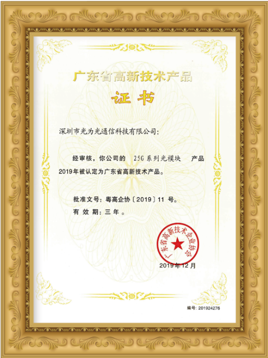 ICC訊 喜訊!近日,光為光通信憑借優(yōu)異的產(chǎn)品性能和可靠的產(chǎn)品質(zhì)量,成功獲得“25G系列光模塊”和“100G系列光模塊”廣東省高新技術(shù)產(chǎn)品榮譽(yù)證書(批準(zhǔn)文號(hào):粵高企協(xié)[2019]11號(hào))。這也是該年度唯一一家同時(shí)榮獲25G和100G全系列光模塊高新技術(shù)產(chǎn)品認(rèn)定的通信企業(yè)。
