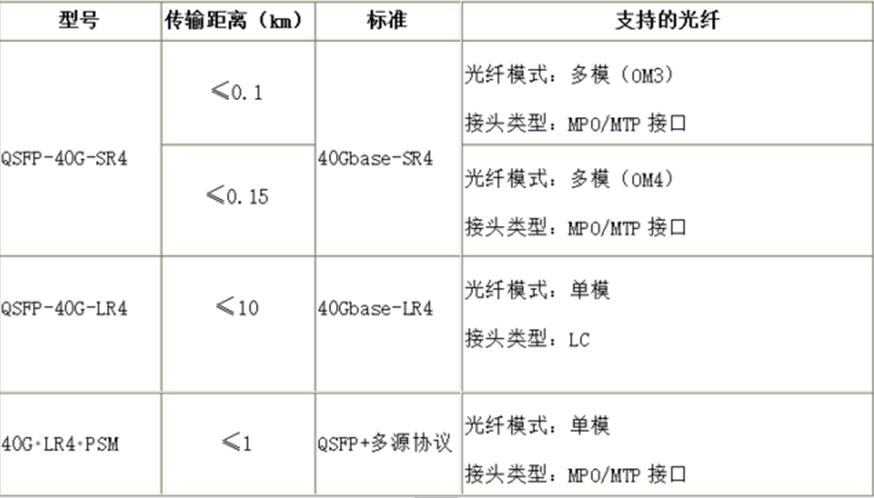 QSFP-40G-SR4光模塊在40G網(wǎng)絡(luò)傳輸中常與MPO/MTP接頭一起使用,用多模光纖的傳輸,在搭配OM3跳線時能支持100米傳輸距離,搭配OM4跳線時支持150米傳輸距離;QSFP-40G-LR4光模塊一般與LC接頭連接,支持的單模光纖最大傳輸距離可達 10km;40G LR4 PSM光模塊利用4路并行設(shè)計的MPO/MTP接口,用單模光纖可實現(xiàn)1km的傳輸距離。(具體可參見下表)