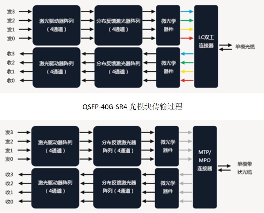 從上表中不難看出這兩種模塊的接頭類型是相同的,但是QSFP-40G-SR4光模塊常用多模光纖進行傳輸,傳輸距離較短,QSFP-40G-LR4光模塊多用單模光纖進行傳輸,傳輸?shù)木嚯x更遠一些,下面的圖分別表示的是兩種模塊的傳輸過程。