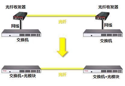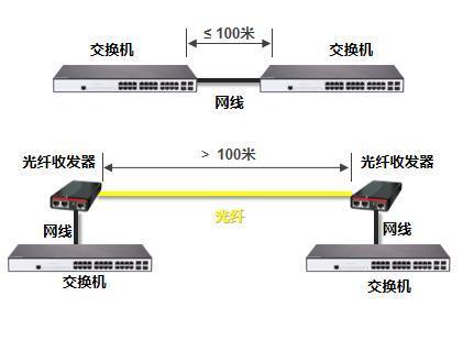 當然,這難不倒聰明的工程師。當兩臺交換機之間的距離超過100米,我們用光纖替代了原來的網(wǎng)線,并使用光纖收發(fā)器進行光電轉(zhuǎn)換。