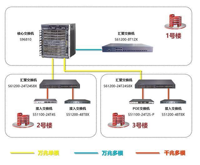 樓之間的光纖長度為8公里+核心交換機和匯聚交換機之間萬兆連接,可推導(dǎo)出——1號樓核心交換機和2、3號樓匯聚交換機部署單模萬兆10公里光模塊;