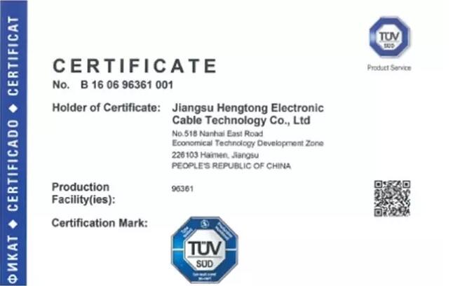 亨通電力產(chǎn)業(yè)集團江蘇亨通電子線纜科技有限公司獲得德國TUV集團頒發(fā)的國內(nèi)首張新能源汽車車內(nèi)用電纜產(chǎn)品TUV SUD證書。