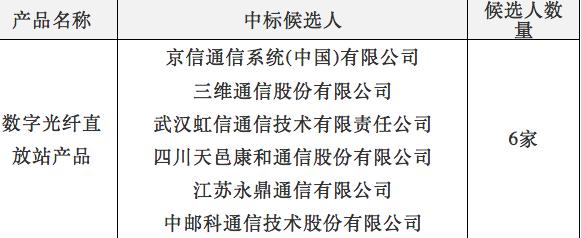 ICCSZ訊 日前,中國電信發(fā)布了2017年數(shù)字光纖直放站產(chǎn)品集采項目中標人,共有六家企業(yè)中標。分別是: