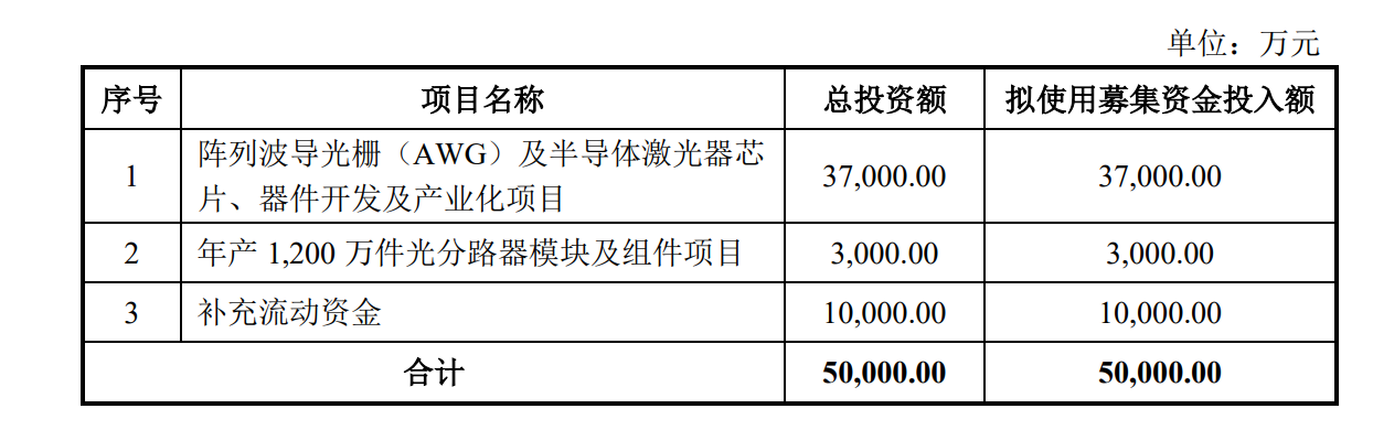 本次仕佳光子擬發(fā)行股票數(shù)量不低于 4,600 萬股,擬募集資金5億元,用于陣列波導(dǎo)光柵(AWG)及半導(dǎo)體激光器芯片、器件開發(fā)及產(chǎn)業(yè)化項(xiàng)目、年產(chǎn) 1,200 萬件光分路器模塊及組件項(xiàng)目以及流動資金。