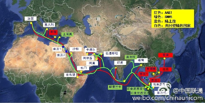 中國聯(lián)通參與投資建設(shè)的亞歐5號海纜,連接新加坡、馬來西亞、印度尼西亞、孟加拉國、斯里蘭卡、緬甸、巴基斯坦、吉布提、沙特、阿聯(lián)酋、埃及、土耳其、意大利、法國等19個國家,骨干段設(shè)計容量為24Tbps,直接延伸至法國、意大利、新加坡中立POP點(diǎn)。