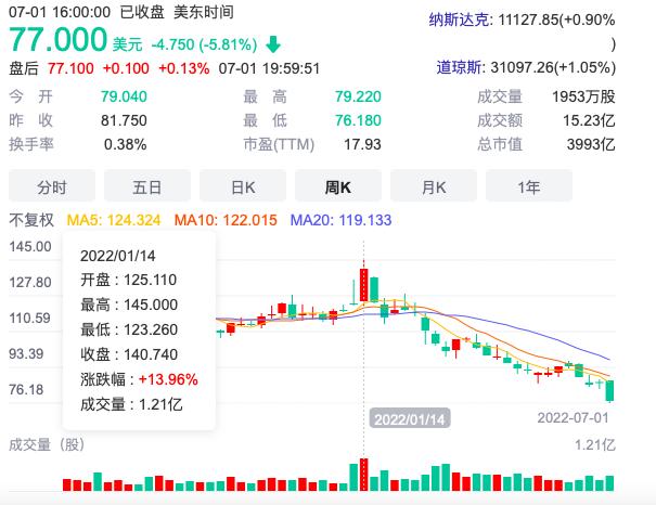 ICC訊 美國當(dāng)?shù)貢r(shí)間7月1日晚間,晶圓代工龍頭臺(tái)積電股價(jià)在開盤快速下挫,全天表現(xiàn)無力,最終收盤暴跌5.81%,報(bào)收77美元/股。市值則跌破4000億美元,為3993億美元。
