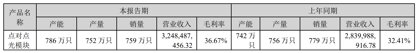 公告指出,新易盛產(chǎn)品在高速率光模塊營業(yè)收入較上年同期持續(xù)增長,凈利潤較上年同期持續(xù)保持增長。2022年,公司點(diǎn)對點(diǎn)光模塊銷量達(dá)到759萬只,營收貢獻(xiàn)達(dá)32.48億元,毛利率達(dá)36.67%,上年同期銷量達(dá)779萬只,營收貢獻(xiàn)達(dá)28.40億元,毛利率為32.41%。