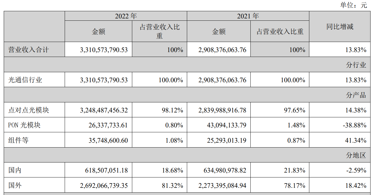 ICC訊 4月26日,成都新易盛通信技術(shù)股份有限公司(簡稱新易盛)發(fā)布2022年年度報(bào)告,報(bào)告期內(nèi)公司實(shí)現(xiàn)營業(yè)收入33.11億元,同比增長13.83%,歸屬于母公司股東的凈利潤9.04億元,同比增長36.51%。2022年新易盛抓住良好的市場發(fā)展機(jī)遇,新產(chǎn)品研發(fā)及市場開拓工作持續(xù)取得進(jìn)展,客戶結(jié)構(gòu)及產(chǎn)品結(jié)構(gòu)進(jìn)一步優(yōu)化,高速率光模塊、硅光模塊、相干光模塊等相關(guān)研發(fā)項(xiàng)目取得多項(xiàng)突破。