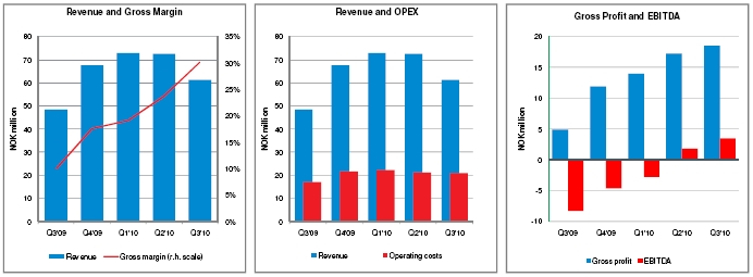 2010年第三季度銷售收入為6120萬挪威克朗,同比增長26%。由于季節(jié)性的下降,相比上個(gè)季度的7260萬挪威克朗有所下降。