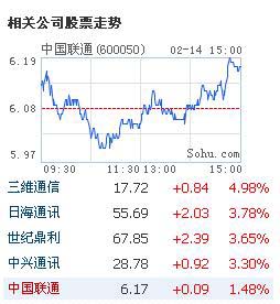 三維通信17.72+0.844.98%日海通訊55.69+2.033.78%世紀(jì)鼎利67.85+2.393.65%中興通訊28.78+0.923.30%中國(guó)聯(lián)通6.17+0.091.48%而電信運(yùn)營(yíng)商中國(guó)聯(lián)通受月度新增3G用戶利好數(shù)據(jù)刺激,漲幅為16.26%。