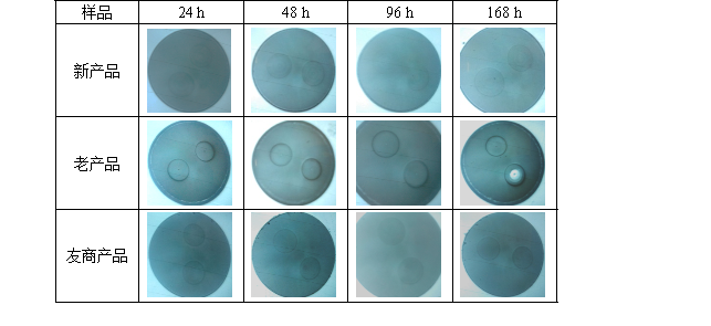 將研磨后的大模場器件用保偏光纖端面裸露在高溫高濕(85?C,85%RH)環(huán)境下定期觀察。分別觀察24h,48 h,96h和168 h時光纖端面的水解情況,每種光纖取典型的端面如表1所示??梢钥闯?,老產(chǎn)品出現(xiàn)端面應(yīng)力區(qū)水解的情況,新產(chǎn)品在水解方面,性能與友商相同,甚至更好。