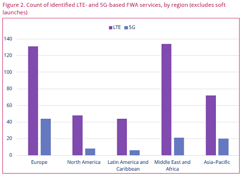 使用LTE5G提供FWA服務(wù)的運(yùn)營商數(shù)量因地區(qū)而異。歐洲比其他任何地區(qū)都有更多的運(yùn)營商推銷FWA服務(wù),緊隨其后的是中東和非洲。
