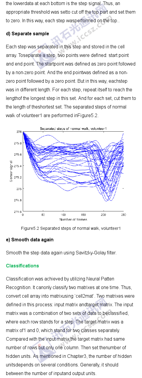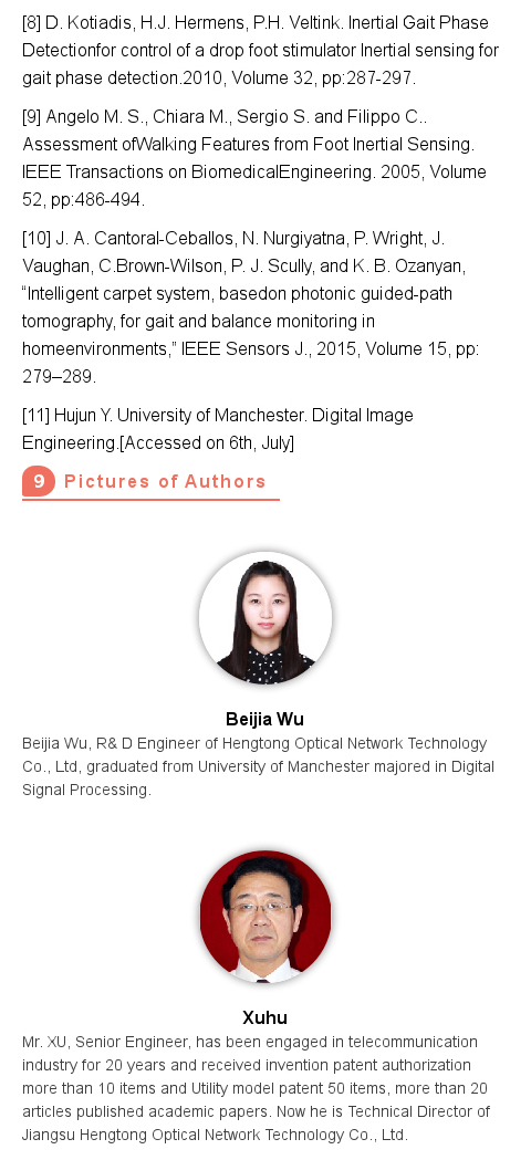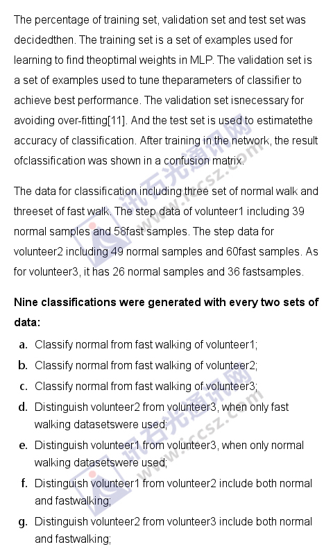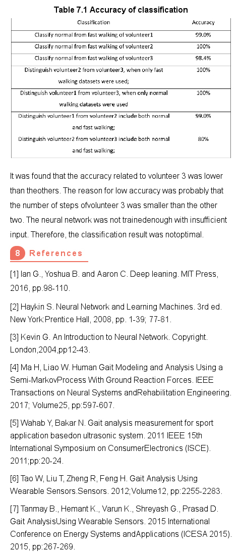 摘要:Each person has an individual walking habit related to human gait, including speed cadence, etc. Thus, gait of different people can be classified. In this paper, gait data was collected from a sensor system called intelligent carpet. The so-called intelligent carpet consists of optical fibers and is based on Photonic Guided-Path Tomography (PGPT). The raw data was pre-processed and separated into single steps. Artificial Neural Network (ANN) was applied to achieve data classification. The specif