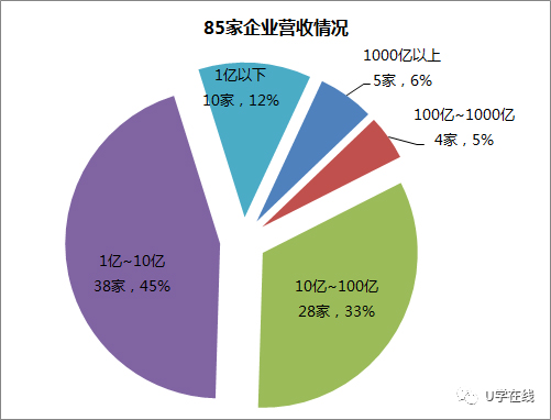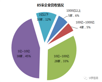 85家企業(yè)中,營收在10億元及以上的企業(yè)共有37家,占比44%,其中5家營收在1000億元以上,4家營收在100億~1000億之間,28家營收在10億~100億之間。營收在10億元以下的企業(yè)有48家,其中38家營收在1億~10億之間,其余10家企業(yè)營收在1億元以下。