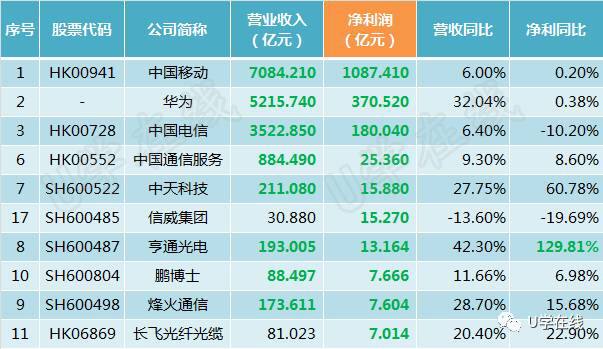 利潤方面,7家企業(yè)2016年歸屬于上市公司股東的凈利潤超過10億元,分別是中國移動(dòng)、華為、中國電信、中國通信服務(wù)、中天科技、信威集團(tuán)、亨通光電。其中、中國移動(dòng)、華為、中國電信凈利潤超過100億元,特別是中國移動(dòng)凈利潤達(dá)到1087億元,占85家企業(yè)凈利潤總和的62%。