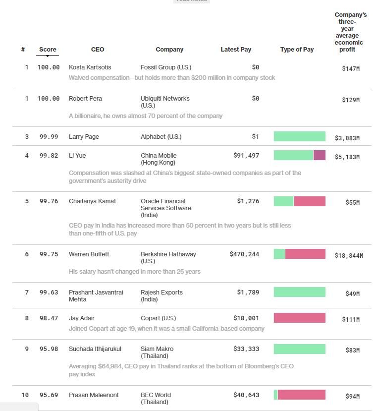 排名第一的Fossil集團(tuán)首席執(zhí)行官Kosta Kartsotis表示,自己沒有任何薪水。谷歌CEO佩奇則排在榜單第三位,因?yàn)樗墓べY為每年1美元。中國移動CEO李躍也因?yàn)?ldquo;工資低”而排到了第四名,其年薪僅還不到10萬美元。作為曾經(jīng)的世界首富,巴菲特也在默默為自己的伯克希爾公司發(fā)光發(fā)熱,其年薪為47萬美元,這一薪資標(biāo)準(zhǔn)已保持25年未變。