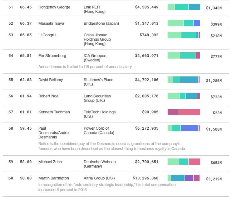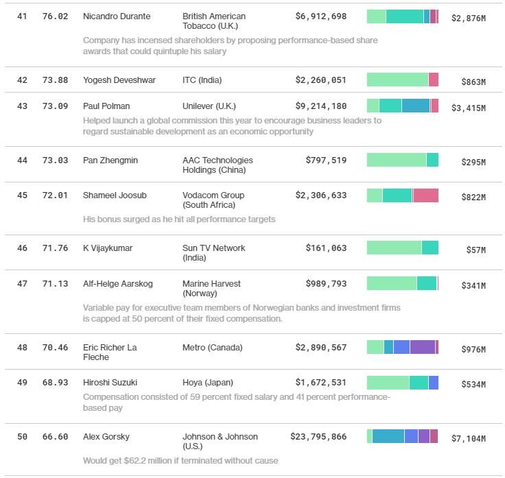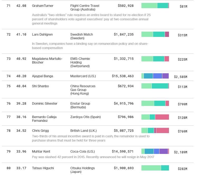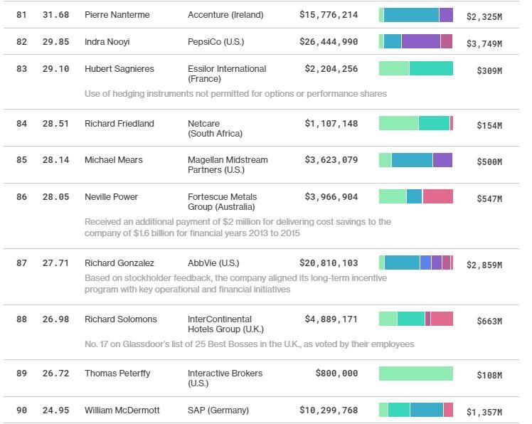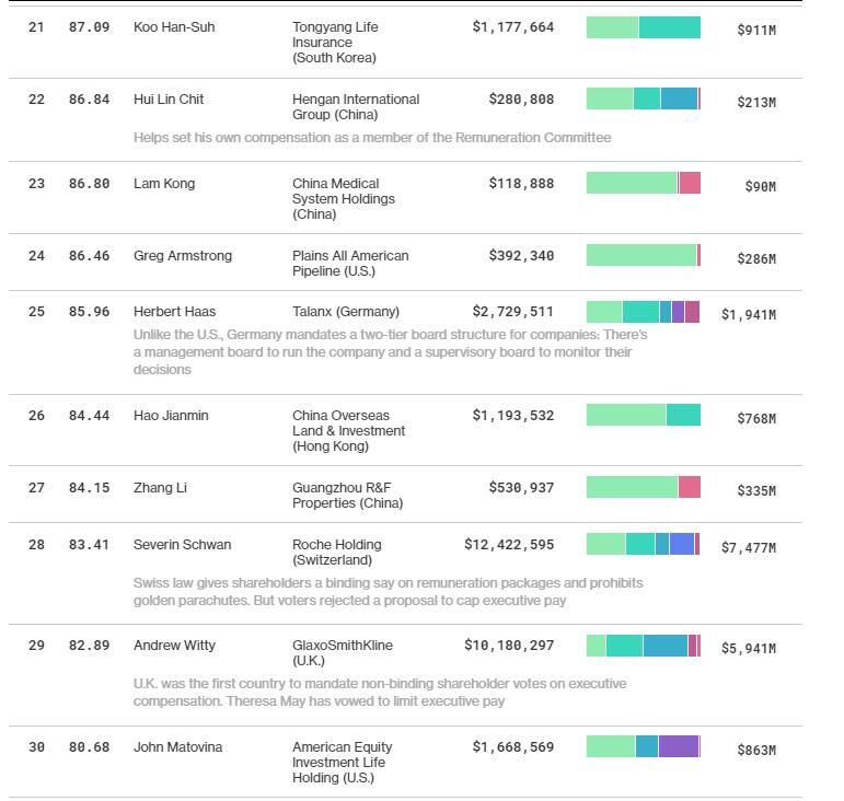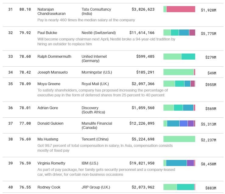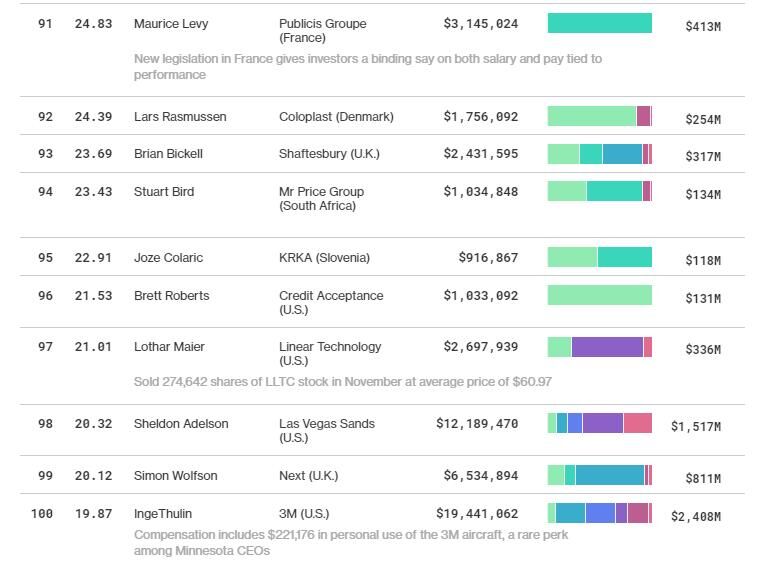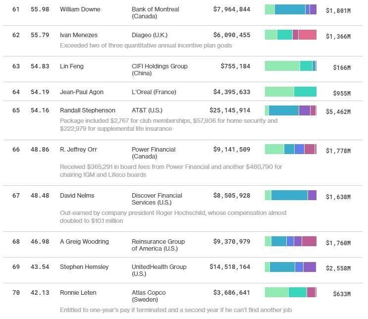 彭博社對比了全球100家巨頭公司的CEO工資性能比,看看哪些公司從CEO那里獲得最大的價值,從而做出了排名。在彭博社的評估中,總體薪酬計算衡量的因素包含薪金、獎金、股票、期權(quán)獎勵、非股權(quán)激勵計劃、退休計劃和零星支付等。
