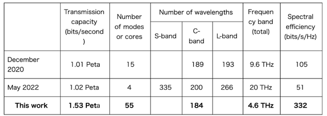 這一成果是由日本國(guó)家信息與通信技術(shù)研究所(NICT,日本)網(wǎng)絡(luò)研究所的一組研究人員創(chuàng)造的,研究人員通過(guò)對(duì) 55 個(gè)不同光頻率的信息進(jìn)行編碼(一種稱(chēng)為多路復(fù)用的技術(shù)),實(shí)現(xiàn)了每秒約 1.53 Pb 的帶寬。