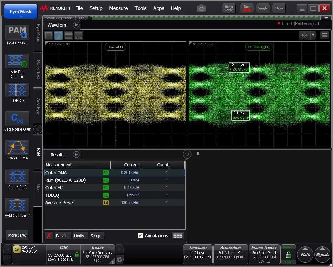在三溫情況下,發(fā)端眼圖TDECQ<2dB, 收端OMA靈敏度<-8.5dBm@2E-4。