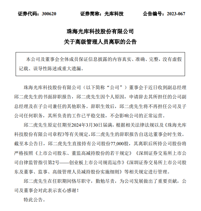 ICC訊 11月28日,光庫科技發(fā)布公告稱,董事會于近日收到副總經(jīng)理邱二虎的書面辭職報告,邱二虎因個人原因,申請辭去其所擔(dān)任的公司副總經(jīng)理及在子公司兼任的其他職務(wù)。辭職生效后,邱二虎將不再擔(dān)任公司及子公司任何職務(wù),其所負(fù)責(zé)的工作已平穩(wěn)交接,不會影響公司的正常運營。截至本公告日,邱二虎直接持有公司股份7.7萬股公司股份。