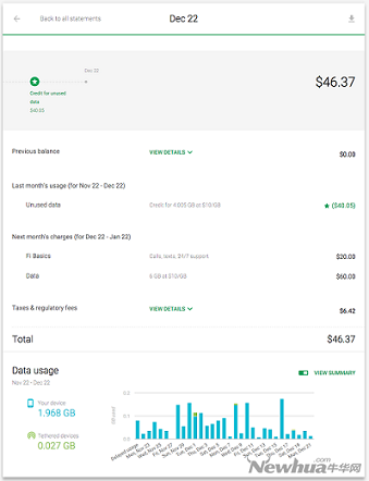 Project Fi另一項(xiàng)討人喜歡的功能是簡(jiǎn)單、一目了然的月報(bào)表。說真的,那些電信公司真該學(xué)習(xí)學(xué)習(xí)谷歌的設(shè)計(jì)。