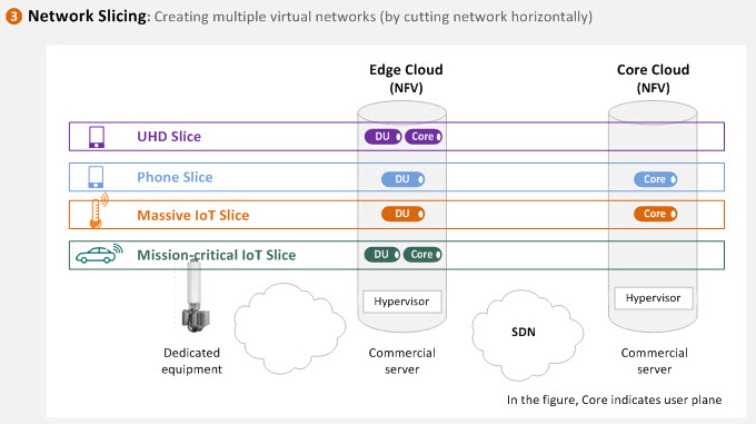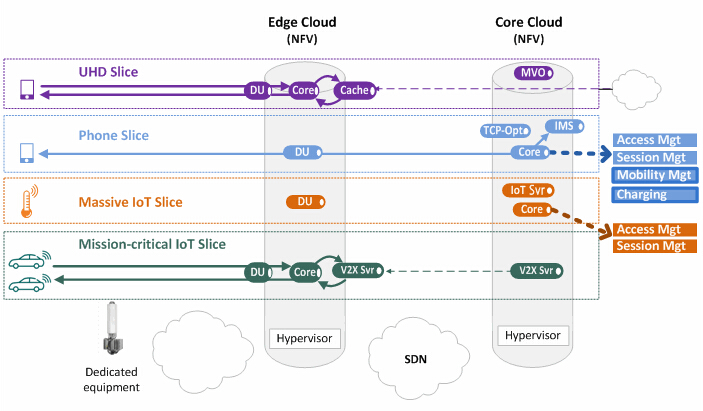 在如今的移動網(wǎng)絡中,主要的設(shè)備是手機。RAN(DU和RU)和核心功能由RAN廠商提供的專用網(wǎng)絡設(shè)備構(gòu)建。為了實現(xiàn)網(wǎng)絡切片,網(wǎng)絡功能虛擬化(NFV)是一個先決條件。基本上,NFV的主要思想是將網(wǎng)絡功能軟件(即分組核心中的MME,S / P-GW和PCRF以及RAN中的DU)全部部署在商業(yè)服務器上的虛擬機,而不是單獨部署在其專用網(wǎng)絡設(shè)備。這樣,RAN當作邊緣云,而核心功能當作核心云。位于邊緣和核心云中的VM之間的連接使用SDN進行配置。然后,為每個服務(即電話切片、大規(guī)模物聯(lián)網(wǎng)切片、任務關(guān)鍵的物聯(lián)網(wǎng)切片等等)創(chuàng)建切片。