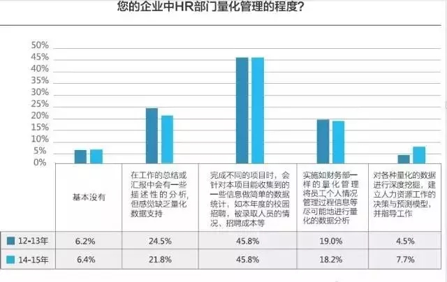 根據(jù)統(tǒng)計(jì)2016年相比2012-2013年,2014-2015年在“對(duì)各種量化的數(shù)據(jù)進(jìn)行深度挖掘,建立人力資源工作的決策與預(yù)測(cè)模型,并指導(dǎo)工作”上增長(zhǎng)較明顯,我們可以明顯的看出企業(yè)對(duì)數(shù)據(jù)越來越重視,更加傾向用科學(xué)的方法推動(dòng)工作。