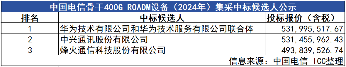 ICC訊 12月12日,中國電信發(fā)布中國電信骨干400G ROADM設(shè)備(2024年)集采項目中標(biāo)人公示,3名投標(biāo)人參與投標(biāo),評標(biāo)委員會按照招標(biāo)文件規(guī)定的綜合評估法對所有遞交的投標(biāo)文件進(jìn)行了評審,經(jīng)過評審,中標(biāo)人排名分別為華為、中興、烽火。相比中國電信ROADM設(shè)備(2023年)單一來源集采,諾基亞貝爾不在中標(biāo)候選人其中。