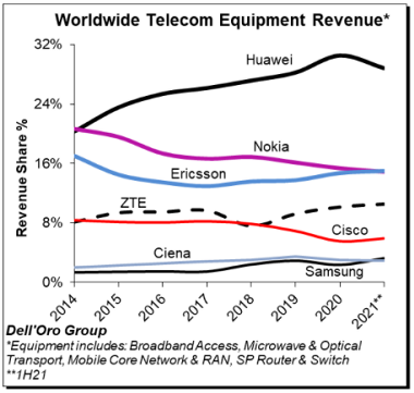 分析表明,從2020年至1H21期間,領(lǐng)先供應商的全球份額保持相對穩(wěn)定,前七名供應商約占總市場的81%。Dell'Oro估計,在此期間,華為和諾基亞丟失了一些優(yōu)勢,而思科、愛立信、三星和中興通訊在同一時期份額小幅上升。