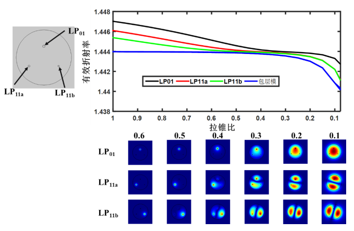 以拉錐型三模選模光子燈籠為例闡述模式復(fù)用技術(shù):三模選模光子燈籠將三根單模光纖緊密對稱的分布在折射率略低于光纖包層的玻璃套管里,然后對整個套管進(jìn)行拉錐處理,拉錐過程中單模光纖纖芯直徑逐漸減小,以至于激光大部分從纖芯泄漏到包層,纖芯與原有包層成為無效波導(dǎo)結(jié)構(gòu)。同時,每根光纖的原有包層也和鄰近光纖的原有包層進(jìn)行熔合,逐漸形成新的導(dǎo)光纖芯,外層玻璃套管在拉錐的過程中變?yōu)樾碌陌鼘樱w結(jié)構(gòu)形成新的纖芯/包層波導(dǎo)。光子燈籠的拉錐末端同少模光纖相連接,實現(xiàn)了多個基模向高階模的轉(zhuǎn)換,達(dá)到模式復(fù)用的效果。三模選模光子燈籠的有效折射率及模式演變?nèi)鐖D2所示。
