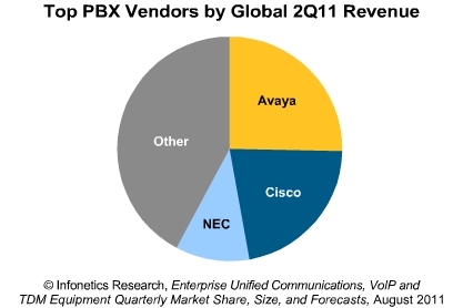 “隨著企業(yè)轉(zhuǎn)向IP和統(tǒng)一通信解決方案,頂尖的企業(yè)電話供應(yīng)商仍然在緊張的戰(zhàn)斗中以獲取新的客戶、守住現(xiàn)有客戶。連續(xù)三個(gè)季度,Avaya一直領(lǐng)跑于整個(gè)PBX市場,其中憑借穩(wěn)定的出貨量以及健康的平均售出價(jià)格,11年二季度占據(jù)全球PBX銷售收入的四分之一。Cisco有力的保持著第二位盡管在整個(gè)電線出貨量稍稍領(lǐng)先。”Infonetics VOIP以及IMS專業(yè)分析師Diane Myers指出。
