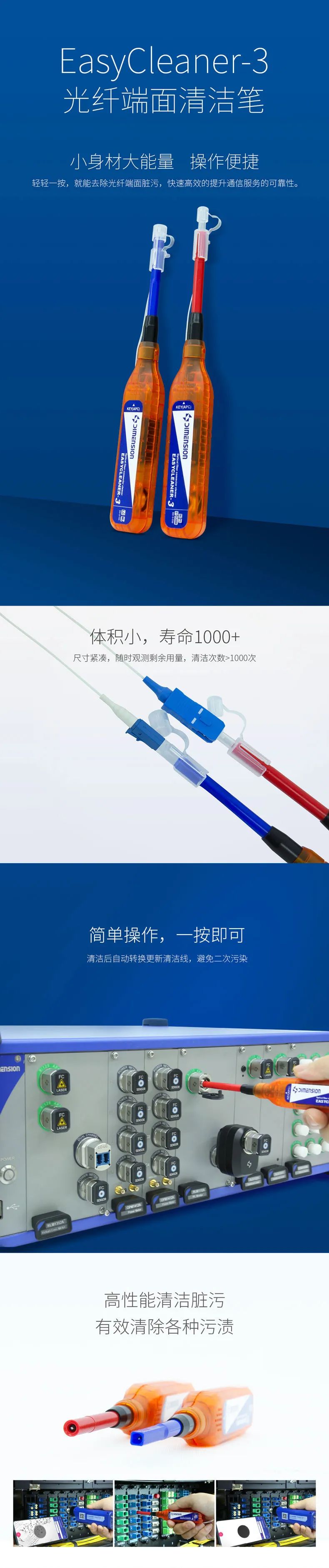 摘要:維度科技EasyCleaner-3光纖端面清潔筆專為光學連接器開發(fā),不需要清潔液,方便攜帶,只需輕輕一按,就能去除光纖端面的臟污,能夠快速高效提升通信服務的可靠性。