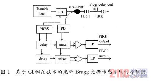 圖1是基于CDMA技術(shù)的光纖Bragg光柵傳感系統(tǒng)原理圖。光源的輸出受偽隨機序列碼(PRBS)的調(diào)制,F(xiàn)BG傳感陣列對一個給定的PRBS響應(yīng)與延遲一定時間的同一個PRBS進行相關(guān)運算,其結(jié)果經(jīng)低通濾波器濾波后即可得到某一個特定傳感器上返回的波長編碼信號。經(jīng)過預(yù)先設(shè)置傳感器位置,再經(jīng)調(diào)制后,光源輸出信號到達某一傳感器并返回到探測器所需的時間是確定的,因此通過適當選擇送到相關(guān)器的PRBS的延遲時間,就可確定相關(guān)運算結(jié)果來自于哪個傳感器,即可在獲得傳感信息的同時實現(xiàn)尋址。