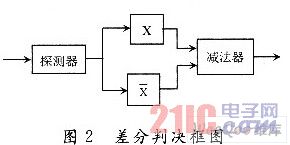 在此,對信號進行差分檢測,如圖2所示。圖中X表示序列自相關(guān)解碼器;X表示序列與其共軛序列相關(guān)解碼器。對于m序列調(diào)制信號,在一個周期內(nèi)對確定的延遲時間,X為最大值(歸一化后為1)時,X將取到最小值,這樣在判決端很容易判別信號。