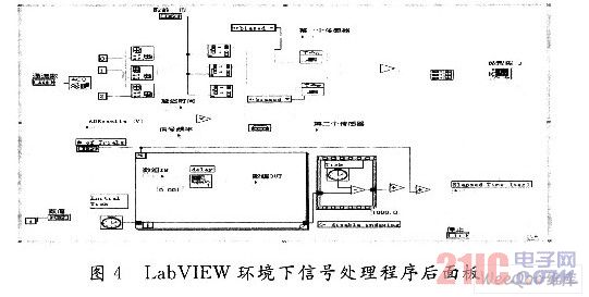 實驗中,將采集到的信號在虛擬儀器軟件LabVIEW中進行處理。具體處理如下所述:采集卡的3個通道中,第1,2兩個通道采集DSP通過緩沖驅(qū)動電路后的信號(其中一路信號需要將其延時);第3個通道采集送光電探測器探測到的信號。將3個通道的信號在同步節(jié)點下送入系統(tǒng)程序,程序后面板程序如圖4所示。