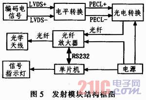 信號(hào)光發(fā)射電路結(jié)構(gòu)框圖如圖5所示。該原理框圖輸入端是經(jīng)過編碼后的電平信號(hào),通過電平轉(zhuǎn)換將LVDS高速信號(hào)轉(zhuǎn)換成適合電光轉(zhuǎn)換模塊輸入的PECL電平信號(hào),之后把電信號(hào)通過電光轉(zhuǎn)換模塊將光信號(hào)耦合進(jìn)光纖,光纖尾端輸出連接到摻銀鉺