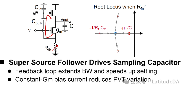 為了解決寬帶 T/H 電路中的電容泄漏問題,采用了超級源極跟隨器 (SSF) 來驅(qū)動采樣電容,如圖 4 所示。SSF 集成了一個反饋環(huán)路,可擴(kuò)展帶寬并加快沉淀時間,同時恒定 gm 偏置電流可減少 PVT 變化。