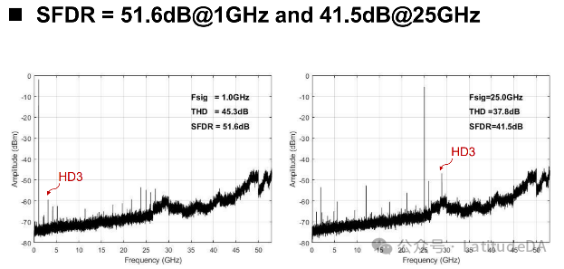 DAC 的帶寬超過 35GHz,總諧波失真 (THD) 相當(dāng)于 ENOB 超過 6 位(最高達(dá) 27GHz)(圖 12)。SFDR 在 1GHz 時達(dá)到 51.6dB,在 25GHz 時達(dá)到 41.5dB(圖 13)。