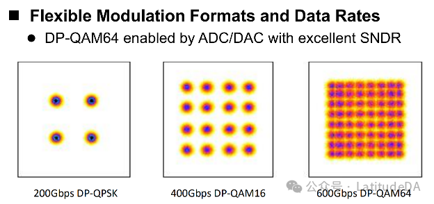 光電環(huán)路星座圖顯示了收發(fā)器的靈活性,支持各種調(diào)制格式(DP-QPSK、DP-QAM16 和 DP-QAM64)以及 200Gbps 至 600Gbps 的數(shù)據(jù)速率(圖 15)。