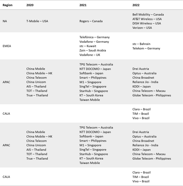 截至2022年底,我們已確定39家MNO部署了5G SA eMMB網(wǎng)絡(luò)。以下列表不包括其中一些可能只提供5G SA專用網(wǎng)絡(luò)或5G FWA網(wǎng)絡(luò)的MNO。出乎意料的是,與2021的15個跨國公司相比,2022年只有16個跨國公司被列入名單。2022年早些時候,人們曾希望5G SA商用數(shù)量會增加,但隨著時間的推移,這種希望逐漸降低。在年底的時候,我們甚至想知道2022年能否比得上2021年。