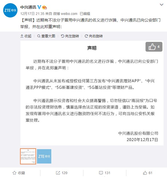 中興通訊稱,從未發(fā)布或授權(quán)任何第三方發(fā)布 “中興通訊理財 APP”、“中興通訊 PPP 模式”、“5G 新基建投資”、“5G 基站投資”等理財產(chǎn)品。