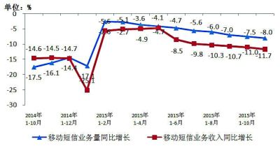 圖6 2014年~2015年11月移動(dòng)短信業(yè)務(wù)量和移動(dòng)短信收入同比增長情況