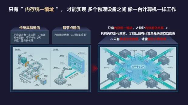 “為什么要有統(tǒng)一內(nèi)存編址的技術(shù)才能真正稱得上超節(jié)點?”他進一步對觀察者網(wǎng)解釋稱,傳統(tǒng)集群的信息傳遞,跟現(xiàn)實生活中寄快遞的方式比較像,需要做相應(yīng)的轉(zhuǎn)換才能找到下單地址。而超節(jié)點希望像在圖書館里檢索書籍一樣,提前進行書籍編址,能快速找到,而且可以變成資源池。如果沒有統(tǒng)一內(nèi)存編址,就不能做到內(nèi)存的池化。如果沒有內(nèi)存池化,計算單元之間的數(shù)據(jù)快速交換很難做到。如果不能快速交換數(shù)據(jù),計算效率是很難提升的。這是為什么說做不到統(tǒng)一內(nèi)存編址,超節(jié)點是很難真正高效地運行起來的原因之一?!?