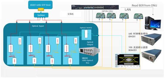 ONU模塊測(cè)試和普通10G及以下速率光收發(fā)模塊基本相同。速率比較低的GPON/EPON以及非對(duì)稱的XGPON,ONU 主要還是1G和2.5G速率,主要采用BOSAsonBoard的方案,隨著速率提升,XGS-PON的ONU主要是以光模塊為主,且其數(shù)量和產(chǎn)值會(huì)逐步提升。目前在ONU端,其主要測(cè)試瓶頸是光眼圖測(cè)試。聯(lián)訊儀器2018年研制成功10GHz寬帶光取樣示波器(DCA4201),其性能已經(jīng)取得了國(guó)外頂級(jí)用戶的認(rèn)可。針對(duì)PON ONU光貓測(cè)試,聯(lián)訊儀器的測(cè)試方案如下: