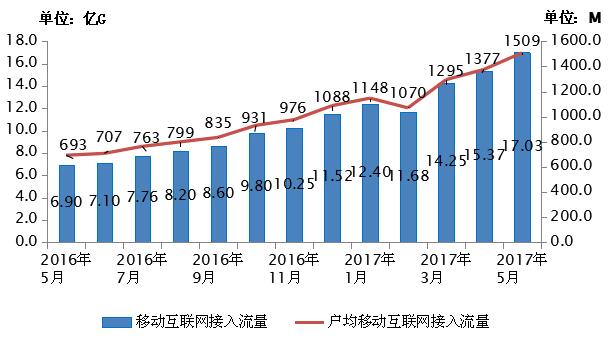 圖82016-2017年5月當(dāng)月移動互聯(lián)網(wǎng)接入流量和戶均流量比較