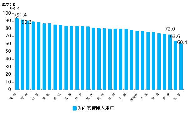 5月末,東、中、西部地區(qū)光纖寬帶接入用戶分別達(dá)到12932萬戶、6669萬戶和5931萬戶,用戶滲透率中部地區(qū)領(lǐng)先,達(dá)到81.2%,東部、西部地區(qū)分別為79.7%和80.4%,各省間光纖寬帶接入用戶占比差異呈縮小態(tài)勢,天津、河北和河南分別居全國前三位,占比均超過90%。