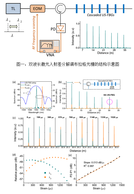 因此,該研究小組在近期的工作中又進(jìn)一步設(shè)計(jì)出一種基于雙波長(zhǎng)窄線寬激光入射的弱光纖光柵傳感陣列解調(diào)方法(圖1)。在解調(diào)系統(tǒng)的輸入端,利用兩個(gè)具有一定中心波長(zhǎng)間隔的激光入射。利用弱反射光纖光柵自身高斯譜型特征并加以功率差檢測(cè),恰好可以得到一個(gè)線性的布拉格波長(zhǎng)到功率差的轉(zhuǎn)換(圖2)。并且它們線性關(guān)系的斜率可以簡(jiǎn)單的通過(guò)控制雙波長(zhǎng)激光的波長(zhǎng)間隔來(lái)進(jìn)行調(diào)節(jié)。此種方法并不像高斯匹配濾波方法那樣對(duì)于濾波器的濾波特性有要求,所以整個(gè)解調(diào)系統(tǒng)較為簡(jiǎn)單。根據(jù)目前的窄線寬激光,光源輸出功率能輕松達(dá)到10dBm以上,該方法在沒(méi)有中繼放大的條件下,能夠支持長(zhǎng)達(dá)50km以上的傳感解調(diào)距離,以及能夠達(dá)到一根光纖上多達(dá)數(shù)百根弱反光柵同時(shí)解調(diào)的效果??梢灶A(yù)測(cè)該方法將在布拉格光柵準(zhǔn)分布式傳感網(wǎng)絡(luò)各個(gè)領(lǐng)域中有著非常好的應(yīng)用前景。
