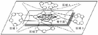 上世紀(jì)90年代末,朗訊推出了容量為512個VC-4的DXC4/4/1設(shè)備,為了解決環(huán)間電路間的靈活調(diào)度,提高資源利用率,上海電信引入了WaveStar DXC4/4/1設(shè)備,作為在骨干節(jié)點(diǎn)上環(huán)間連接的樞紐設(shè)備,而此時的骨干層主要采用的是10G二纖(或四纖)雙向復(fù)用段保護(hù)自愈環(huán),區(qū)域?qū)又饕捎玫氖?.5G二纖雙向復(fù)用段保護(hù)自愈環(huán)。其網(wǎng)絡(luò)結(jié)構(gòu)如右圖所示。